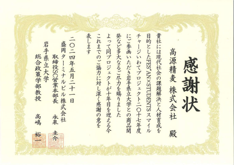 岩手県立大学さま、フェザンさまより感謝状をいただきました。