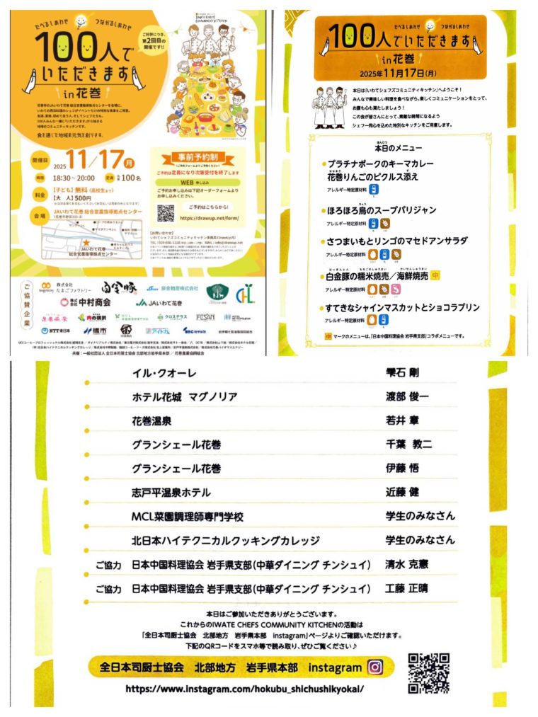 2025年11月17日、「第8回いわてシェフズコミュニティキッチン in 花巻」“100人でいただきます”イベントが、JAいわて花巻 営農拠点センターにて開催されました。